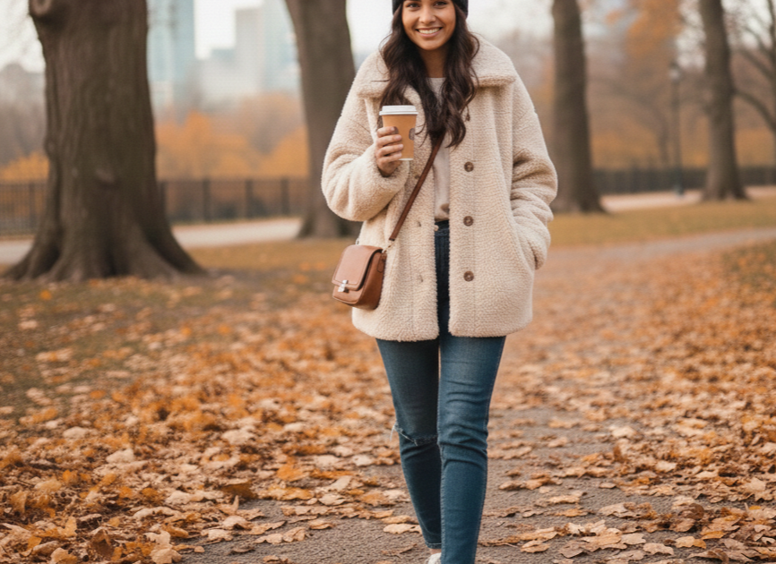 A neutral-colored teddy jacket is a winter staple. It pairs beautifully with denim, boots, and even dresses. Ideal for everyday wear, this style never goes out of fashion.