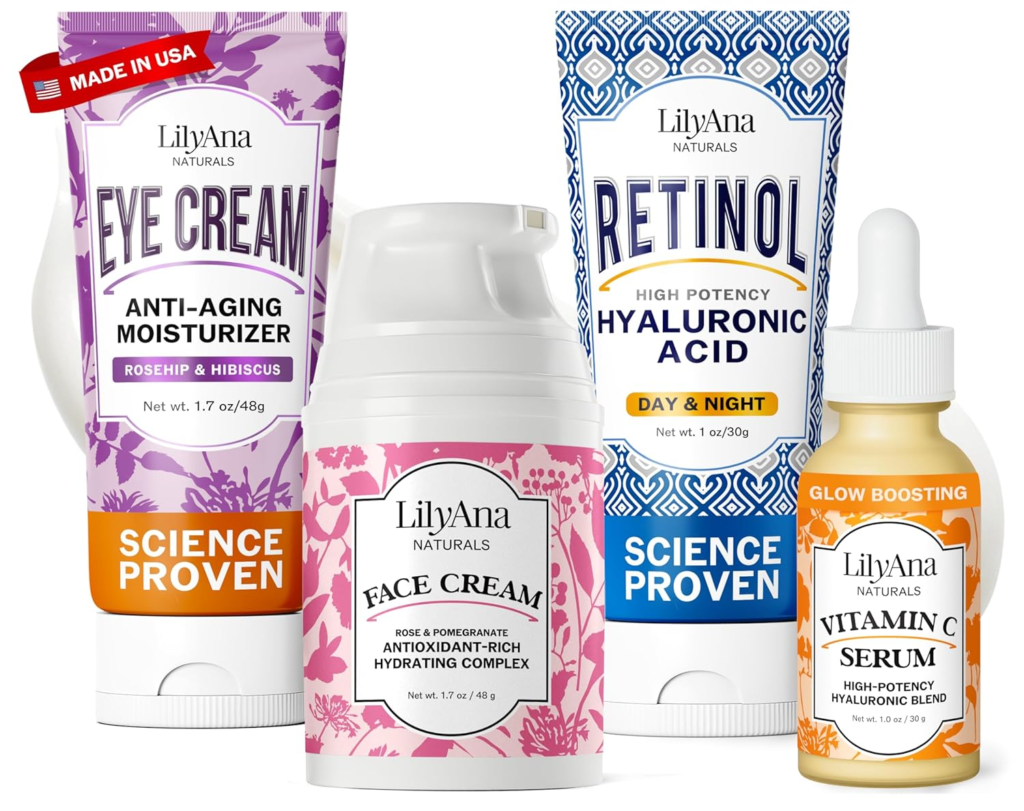 Finding a skincare routine that targets multiple signs of aging—without harsh ingredients—can be challenging. The LilyAna Naturals Skincare Gift Set offers a simple, effective solution by combining four best-selling products into one complete routine: Retinol Cream, Vitamin C Serum, Eye Cream, and Face Cream Moisturizer.