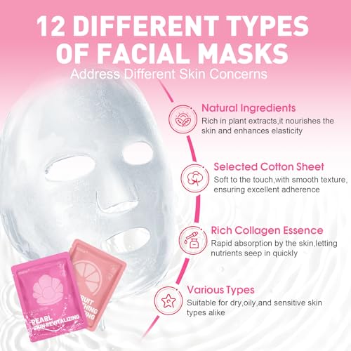 【12 Pack Face Mask Set】Our face masks skincare includes 12 types: seaweed,aloe,collagen,grapefruit,honey,avocado,pearl,lemon,cucumber,pomegranate,charcoal,and milk.Different facial masks target different skin problems,the rich collagen essence is quickly absorbed by the skin,leaving it more hydrated and smooth