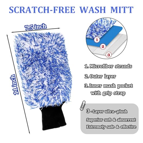 Premium Scratch: Free Car Wash Mitt: The car wash mitt is made of 2 sided blended microfibers, soft, gentle on paint and good cleaning efficiency. The long and dense fiber acts like a hook that easily traps dirt inside, and doesn’t fray or fall apart after a long time of use. Keep your car clean and anti – scratch in your cars paintwork with this super soft microfiber car wash mitt and will not leave scratch on your car surface