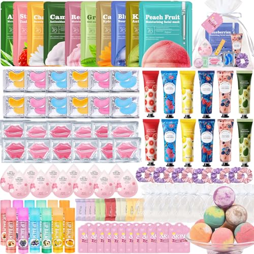 132 PCS Spa Party Supplies for Women, Spa Party Favors Includes Face Masks, Lip Masks, Eye Masks, Hand Cream, Lip Balm, Bath Bombs, Spa Birthday Sleepover Party Supplies Spa Party Favors