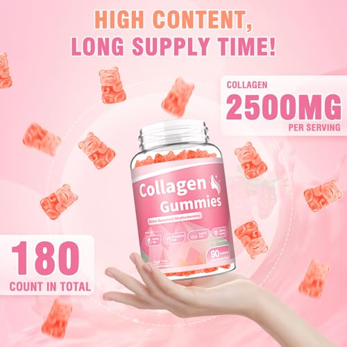 180 Count Collagen Gummies 2500mg Collagen Protein Type I II III V X with Biotin Vitamin C A B D E Keratin Hyaluronic Acid for Hair Skin Nails Joint Immune Digestion Women Men Sugar Free Strawberry