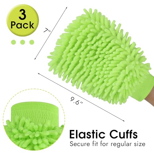 3 Pack Chenille Microfiber Car Wash Mitt, 7″ x 9.6″ Car Washing Mitts, Home Dusting Gloves, Scratch Free Lint-Free, Highly Absorbent, Double Sided, for Cleaning Detailing Polish (Green)