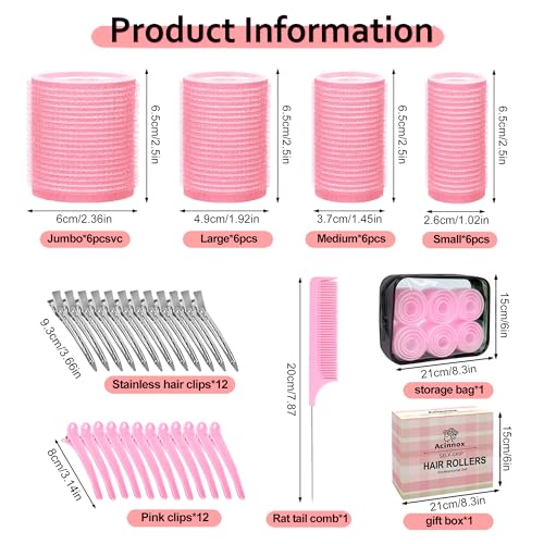 Specification: 4 Sizes Self-Grip Hair Rollers Set with Clips – 4 Sizes for Long, Short Hair & Bangs (25mm, 36mm, 48mm, 60mm), (Pink, 4 Sizes)