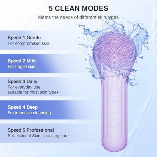 Specification: 5 Modes Silicone Face Scrubber, Waterproof Face Scrubber Exfoliator for Men & Women, Rechargeable Electric Facial Cleansing Brush for Deep Cleansing, Exfoliating, Massage (Purple)