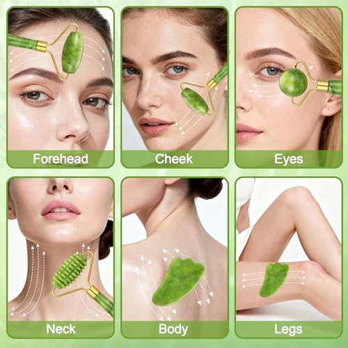 6Pcs Jade Roller for Face,Gua Sha Facial Tools for Women Natural Face Roller Massager Tool for Skincare, Makeup