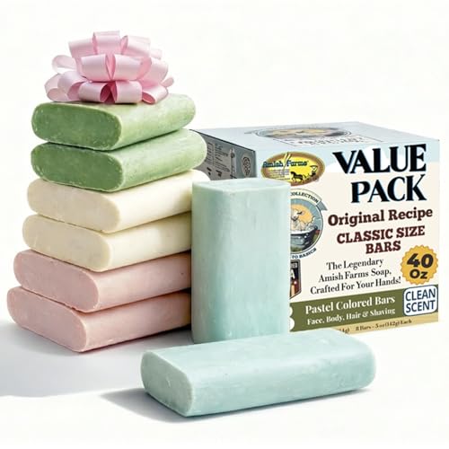 VALUE PACK: MONTHS OF CLEAN — Enjoy 8 palm-friendly bars (40 oz / 2.5 lbs total) in our same beloved Amish Farms formula—now redesigned to fit comfortably in your hand and standard soap dishes. Portable, compact, and easy to grip, each cold-process bar creates a silky, frothy lather that gently cleanses and leaves skin soft, fresh, and cared for every day.