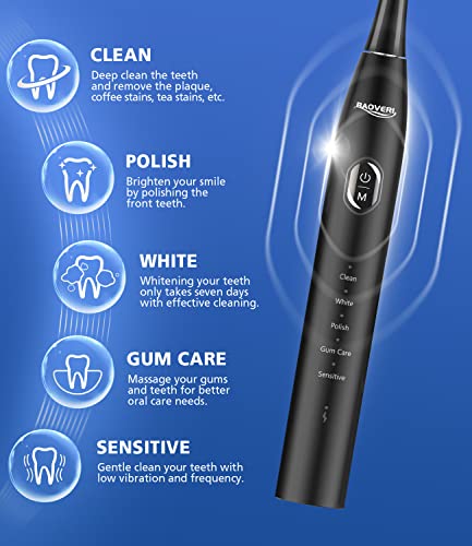 BAOVERI Electric Toothbrush for Adults & Kids,Rechargeable Ultrasonic Electric Toothbrush with 6 Dupont Brush Heads, IPX7 Waterproof, 5 Modes, 2 Minutes Smart Timer, 4 Hours Fast Charge for 60 Days