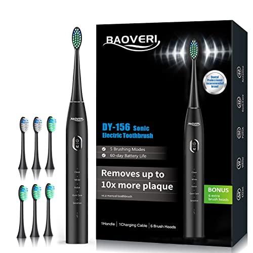 Specification: BAOVERI Electric Toothbrush for Adults & Kids,Rechargeable Ultrasonic Electric Toothbrush with 6 Dupont Brush Heads, IPX7 Waterproof, 5 Modes, 2 Minutes Smart Timer, 4 Hours Fast Charge for 60 Days
