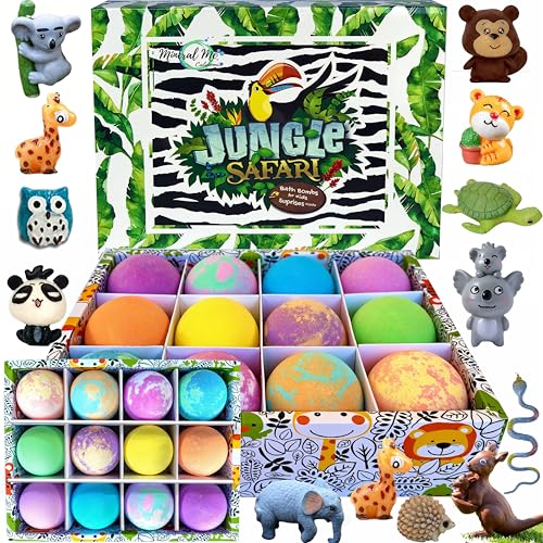 Bath Bombs for Kids with Surprise Inside, 12 Bubble Bath Fizzies with Jungle Animal Toys. Moisturizing, Gentle & Kids Safe, Rainbow Spa Bath Fizz, Birthday Gifts for Boys, Girls