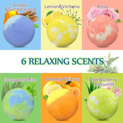LUXURIOUS SET: Contains 12 colorful bath bombs in 6 unique aromatic combinations including Cherry & Fig, Lavender & Honeysuckle, Vanilla & Sandalwood, Rose, Eucalyptus & Mint, and Sakura & Violet
