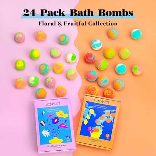 FRAGRANCE FANTASY: Dive into a world of fragrance with LUXDOUCE 24 Pack Bath Bombs, featuring two enchanting series. The Floral Euphoria Series includes 12 bath bombs, offering 6 varied botanical fragrances for a floral experience, while the Fruitful Bliss series comprises another 12 bath bombs with 6 unique, sweet fruit scents for a refreshing feel. Delight in the diversity, personalizing your bath time with a fragrance to match your mood