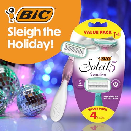BIC Soleil 5 Sensitive Women’s Disposable with 5 Blade Razors, Water Activated Moisture Strip and Anti-Slip Grip, 4-Pack, Holiday Gift