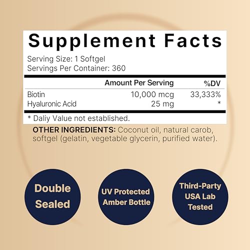 Specification: Biotin 10000mcg + Hyaluronic Acid 25mg | 360 Coconut Oil Softgels, Premium Biotin Vitamins for Hair Skin and Nails, Highly Purified and Bioavailable, Quick Release