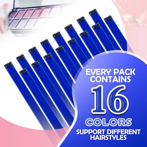 Specification: Blue Hair Extensions Clip in, 16 Pcs Colored Highlights Hair Extensions Synthetic, 22 inch Rainbow Hairpieces for Girls Women Kids Favor Gift & Dress Up Fashion Party Birthday (Blue Hair)