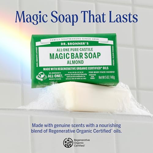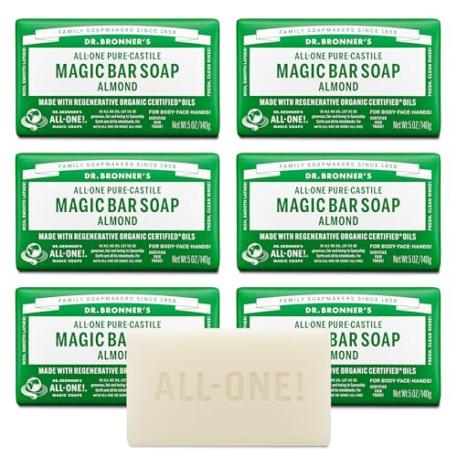 Dr. Bronner’s – Pure-Castile Magic Bar Soap (Almond, 5 oz, 6-Pack) – Made with Regenerative Organic Certified Oils- For Face, Body & Hair, Gentle, Vegan Bath Soaps for Men & Women, Non-GMO