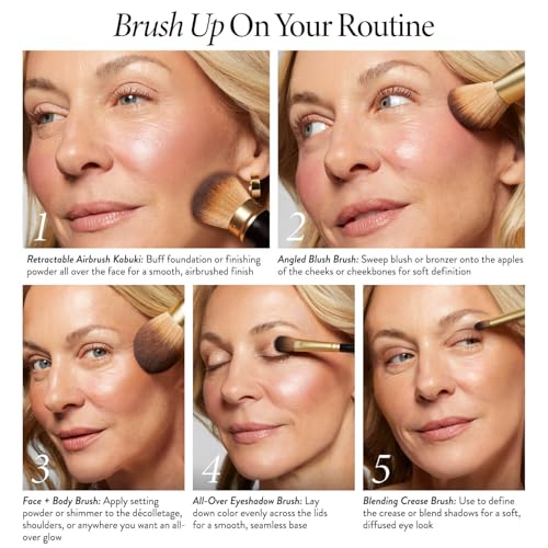 HOW TO USE: Retractable Airbrush Kabuki Brush: Swirl or dip the brush into powder and gently tap off any excess. Apply to skin using sweeping, circular motions. For fuller coverage, apply using a patting motion. Angled Blush Brush: Sweep blush or bronzer across the apples of your cheeks and blend out toward your hairline. Classic Bronzer Brush: Sweep the bristles over the high points of the face for an all-over glow. All-Over Eyeshadow Brush: Glide the brush over shadow and sweep it across lid