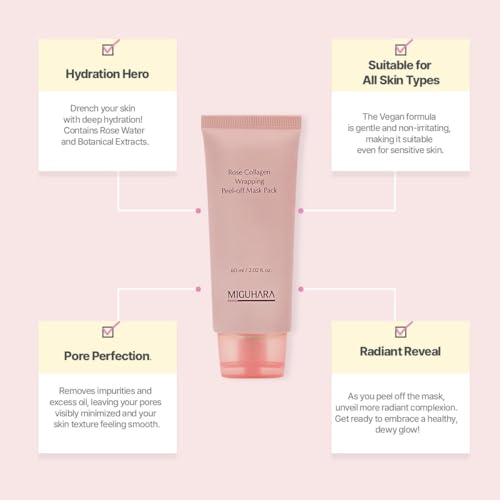 Specification: MIGUHARA Rose Collagen Wrapping Peel-Off Mask Pack, Facial Mask with Damask Rose Water, Hydrolyzed Collagen & Botanical Fruit Extracts for Hydrated, Glowing Look & Korean Glass Skin (60ml/2.02 fl.oz.)