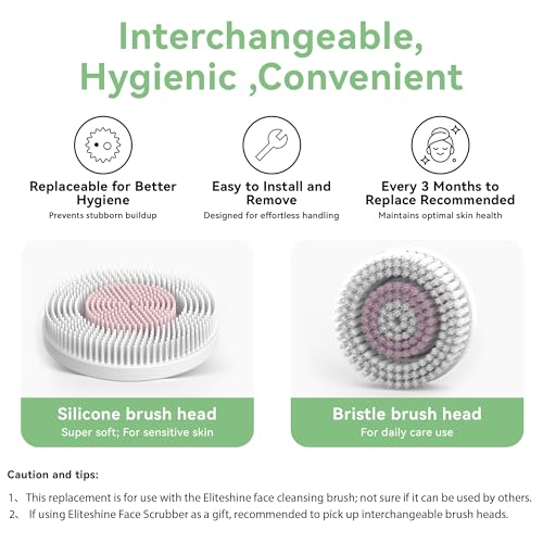 Specification: Original Replacement Heads for Eliteshine Face Scrubber and Facial Brush, for Better Skin Health, 1 Silicone and 1 Bristle Head in Package, Food Grade, Easy-to-Clean, Easy to Install