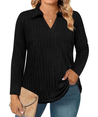 RITERA Plus Size Polo Shirts for Women Knit V Neck Tops Fall Winter Long Sleeve Collared Shirts XL-5XL