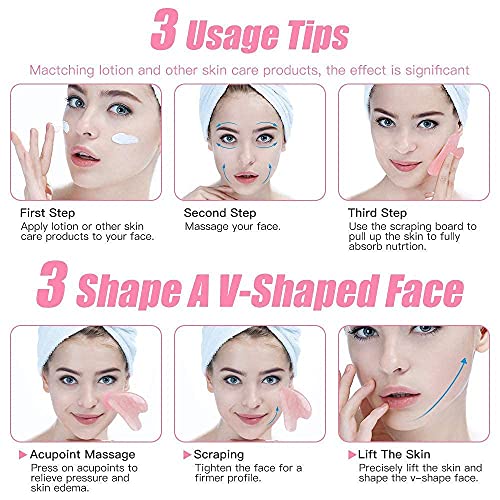 Facial Gua Sha: Two VS angels design and rose quartz crystal which meet our beauty routines need that relief your muscle tension and lymphatic drainage; reduce facial edema and help your skin look fresh; firm your skin and also helps the muscle relax, very smooth for your to scraping your face and your eyes