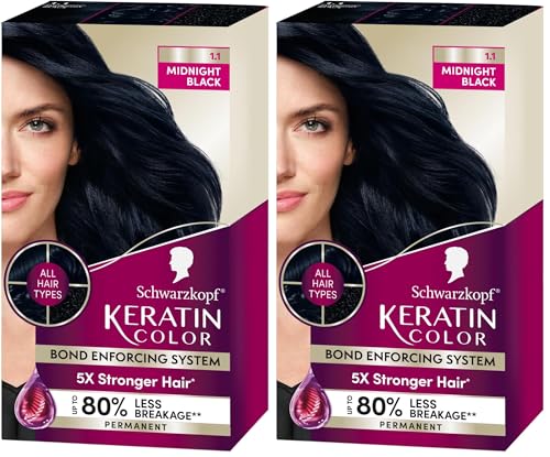 Specification: Schwarzkopf Keratin Color Permanent Hair Color, 1.1 Midnight Black, 1 Application-Professionally Inspired Permanent Hair Dye, for up to 80% Less Breakage vs Untreated Hair and up to 100% Gray Coverage