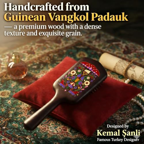 Exclusive Artisan Design – SIMETRA paddle brush boasts a bespoke back pattern by renowned illustrator artist Kemal Şanli, previously designed patterns for many famous company, merging artistic flair with daily functionality as a luxury wooden hair brush, Perfect gift for your friend and families.