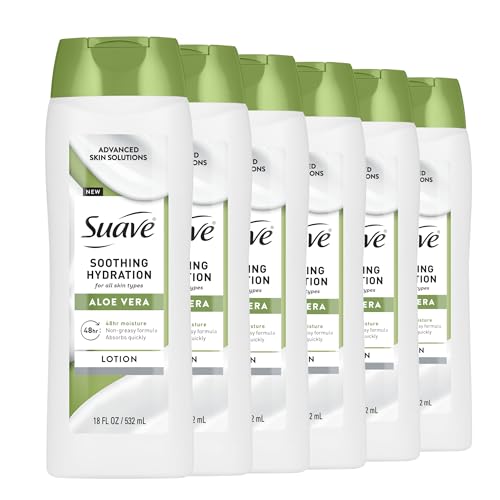 Suave Soothing Hydration Hand & Body Lotion With Aloe Vera Refreshes Dry Skin, Fast Absorbing, Intensive Moisturizing Cream For Women, Non Greasy, Allergen Free, 18 FL OZ, 6 Pack
