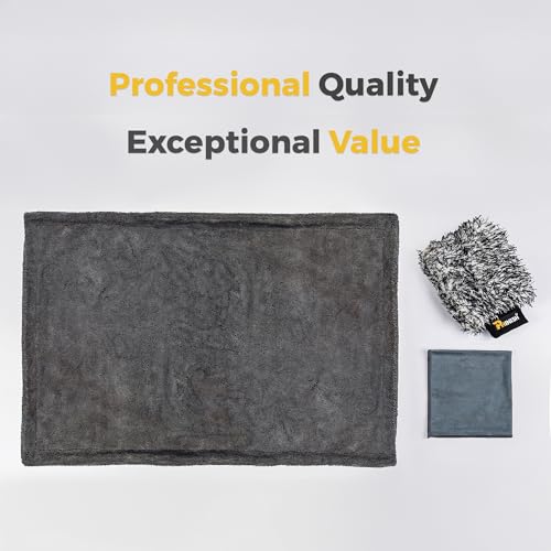 Complete 3-Piece Detailing Kit: The bundle includes 1x Giant Giant Drying Towel, 1x Scratch-Free Wash Mitt, and 1x Streak-Free Glass Towel. Everything you need to wash, dry, and finish like a pro.