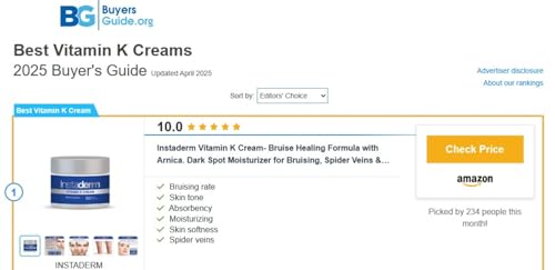 🥇2025 BEST VITAMIN K CREAM BY BUYERS GUIDE.🥇 Vitamin K Cream- Bruise Healing Formula with Arnica. Dark Spot Moisturizer for Bruising, Spider Veins & Broken Capillaries. Repair Under Eye Dark Circles, Fine Lines, Puffiness, Wrinkles Face & Body. Contains professional strength Vitamin K to help clear and fade bruising. Improves the appearance of marks caused by broken capillaries and spider veins. Use as a bruise correcting cream for unsightly bruising to accelerate your skin’s natural healing process. Reduces puffiness and under eye dark circles & bags. Hydrates, soothes, and retains skin’s natural moisture. Reduces the appearance of fine lines, puffy eye bags and wrinkles. Smooth’s and relieves itchy, dry skin with calming and clearing ingredients. Alleviates redness and irritation. Apply twice daily for best results. Helps to open pores for better absorption. Safe for all skin types, including sensitive skin for women & men. Our products are recognized by beauty industry leaders & dermatologists for their best-in-class effectiveness. We continue to research & innovate new formulas for healthier skin. Join thousands of satisfied customers who have discovered the exceptional value and quality of Instaderm skin care products. We invite you to visit our Amazon storefront and discover the beauty that awaits you.