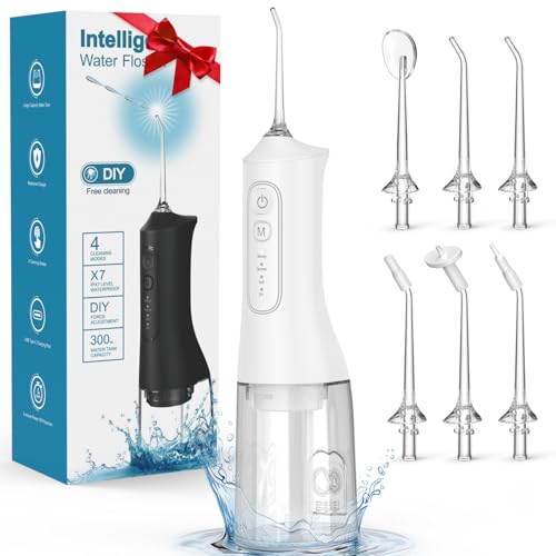 Water Flosser, Rechargeable 300ML IPX7 Waterproof Cordless Portable Oral Irrigator with 4 Modes & 6 Replaceable Jet Tips-Professional Flossing Cleaner for Daily Home Use,Travel,Gums,Braces Care-White