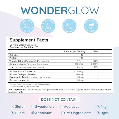 YOUR ALL-IN-ONE BEAUTY SOLUTION: With this winning blend of natural ingredients, WonderGlow offers comprehensive support for your hair, skin, and nails health and beauty from the inside out. Each capsule is packed with essential nutrients that work synergistically to promote strengthened hair and a radiant complexion, smooth texture, and youthful elasticity. Combining the natural benefits of bovine colostrum, collagen, hyaluronic acid, biotin, and lactoferrin, this solution is a beauty cocktail designed to sustain youthfulness and vitality. Revitalize skin cells, increase hydration, reduce fine lines, restore plumpness, and exude a glowing complexion.